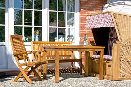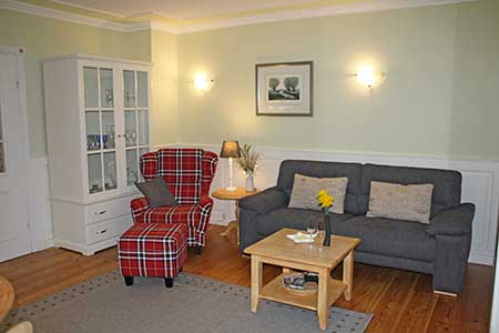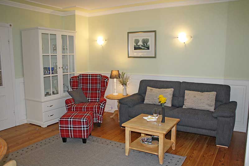 Die Wohnung verfügt über eine gehobene Ausstattung und ist liebevoll im Landhausstil eingerichtet. Sie bietet ein großzügiges Wohn-/Esszimmer mit Küchenzeile, ein Schlafzimmer und Dusche/WC. Sie verfügt zusätzlich über eine große angegliederte Terrasse mit Strandkorb und Gartengarnitur.